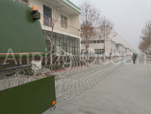 由运载车辆和刀片刺绳组成的安全防护产品,此设计用于暴乱和军事区域提供快速保护,实现了快速部署隔离以及迅速撤离的目的。